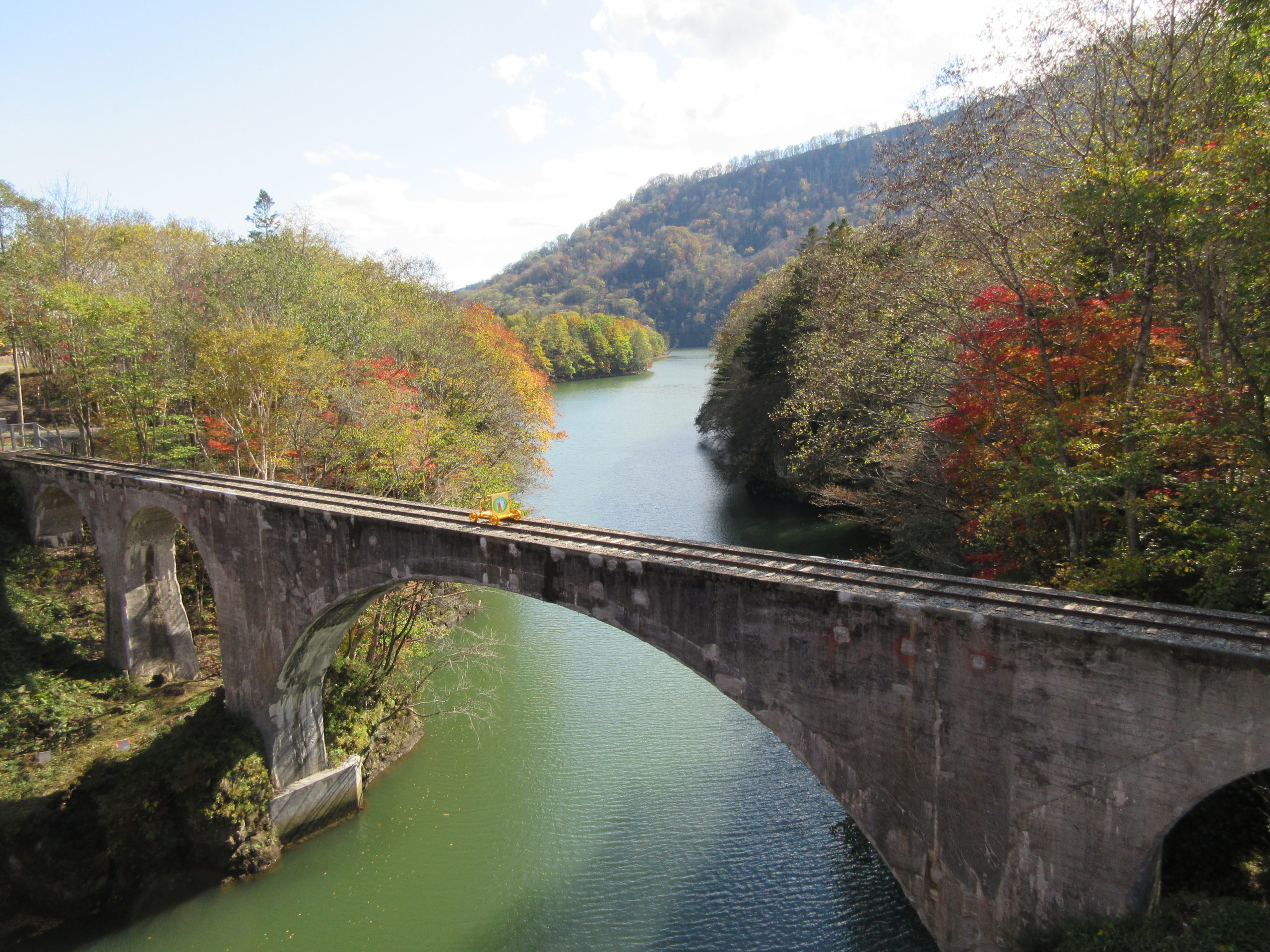 大雪山とは一つの山のことではなくて、旭岳をはじめとする2,000m級の山々が20以上連なった山系のこと。大雪山国立公園の総面積はなんと神奈川県と同じくらい。原生林の中を道がどこまでも続いていて、ドライブしているだけでもとても気持ちが良いのです。エゾマツやシラカバの森が紅く色づき始めています。下の写真は士幌線の第三音更川橋梁跡。かつてここには電車が走っていたのですね。